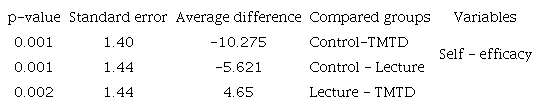 A comparison of the changes in the intervention and control groups in the self-efficacy variable showed that there is a significant difference between the change trend of the control group and TMTD. There is a significant difference between the change trend of the control group and the lecture group. Also, there is a significant difference between the change trend of lecture groups and TMTD. Examining the difference between the mean scores before and after the intervention of intervention groups, TMTD and lectures with the scores of the control group, indicates the effectiveness of self-care training in both teaching methods of TMTD and lectures on patients' self-efficacy. Considering that there is a significant difference between the intervention groups of TMTD and lectures; therefore, the superiority of self-care training is determined with the TMTD over the lecture method (Table 4).