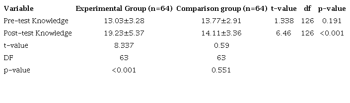 Knowledge. The mean knowledge score of the nursing students was 13.03±3.285 in the experimental group, while in the comparison group it was 13.77±2.915, prior to the implementation of Mobile-based learning. In the post-test, the mean knowledge scores were found higher both in the experimental group (19.23±5.377; mean difference=-6.203) and in the comparison group (14.11±3.36; with a mean difference of 0.344). A paired "t" test was performed to compare the average knowledge scores within the two groups. The calculated "t" value of 8.337 in the experimental group was found to be statistically significant (t (63) = 2.000; p<0.001) at the 0.05 level of significance; in contrast, the calculated "t" value of 0.59 in the comparison group was not statistically significant (t (63) = 2.000; p=0.551). For comparing the mean difference between the experimental and comparison group, unpaired t-test was applied, and the calculated t value of 6.46 (t (126) =1.98; p<0.001) was found to be statistically significant in the post-test. (Table 1)