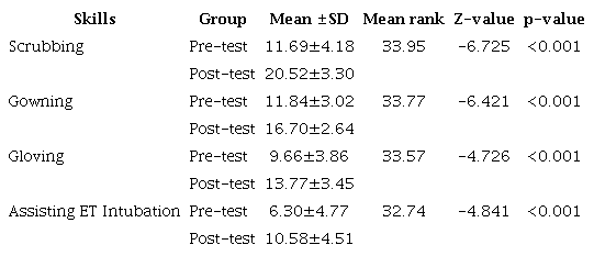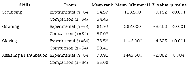 Skills. To compare the skills of nursing students between the groups, Mann-Whitney U test was applied and the results revealed that the mean ranks of skills of students in the experimental group were significantly higher in all areas i.e., Scrubbing, Gowning, Gloving and for Assisting in ET Intubation. (Table 2)