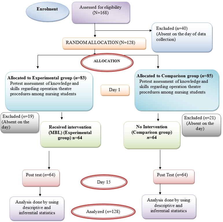 Inclusion & Exclusion criteria. The study included those nursing students who were willing to participate, having their own Smartphone and available during data collection. The nursing students who were absent on three consecutive days and those who did not receive the allocated intervention were excluded from the study.