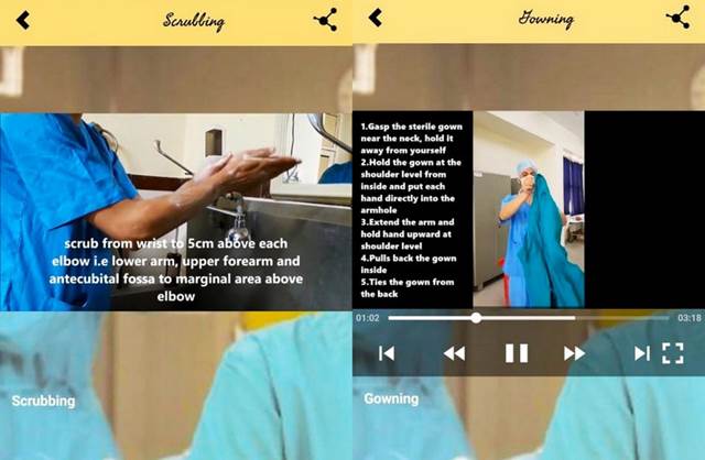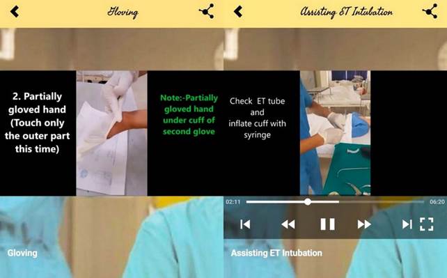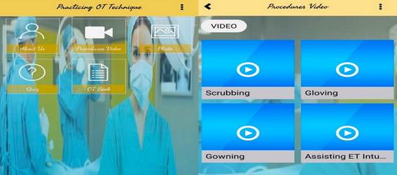 Mobile Based Learning. Mobile Based Learning, which was developed as an intervention in this study, was created considering the learning requirements of nursing students. The application contains various sections, including videos, images, and electronic notes. (Figure 2-4) The following Mobile Based Learning on Operation Theatre techniques were chosen for this study: (i) Scrubbing: Introduction, purposes of scrubbing, and scrubbing procedures. The video is 3 minutes and 51 seconds in length; (ii) Gowning: Introduction, required gowning materials, gowning steps, and removal of personal protective equipment (PPE). The video lasts a total of 3 minutes and 17 seconds; (iii) Gloving: The introduction to gloving, the stages of gloving, and the removal of gloving. The video's duration is 2 minutes and 52 seconds; and (iv) Assisting ET Intubation: Introduction, purposes, procedures of Assisting ET Intubation, ET tube size, and how to secure ET tube. This video is 6 minutes and 19 seconds long. The researcher performed and recorded all procedure videos and then uploaded them to the application. The URL to the application was distributed to the nursing students' WhatsApp group.