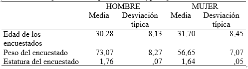 Se trabajó con corredores populares y que aceptaron participar en el estudio de manera voluntaria. Se consiguió una muestra de 473 corredores populares (374 hombres y 99 mujeres) participantes en la San Silvestre Crevillentina (Diciembre 2013) y en el Medio Maratón de Santa Pola (Enero 2014). En la tabla 1 se pueden observar las medias y desviación típica de la edad, peso y estatura de los corredores populares.
