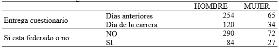 En cuanto al procedimiento para determinar dichas relaciones se tomó como variable dependiente las puntuaciones obtenidas en cada una de las categorías de las escalas, y como variables independientes la entrega de cuestionarios los días anteriores a la carrera o el mismo día, si se está federado o no, y el género.
