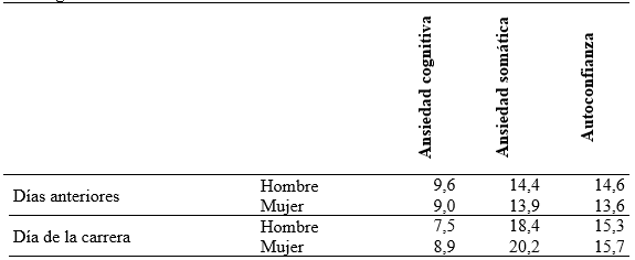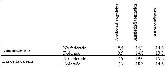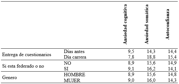 Los corredores que rellenaron el cuestionario los días anteriores a la carrera presentan mayores puntuaciones en ansiedad cognitiva y menores puntuaciones en ansiedad somática y autoconfianza. Los corredores que están federados presentan menores puntuaciones en autoconfianza. Los corredores federados y no federados aumentan su autoconfianza el día de la carrera, siendo menor la autoconfianza de los corredores federados tanto antes como el día de la carrera. Los hombres y las mujeres disminuyen su ansiedad cognitiva y aumentan su ansiedad somática el día de la carrera, siendo menor la ansiedad cognitiva y somática de los hombres el día de la carrera con respecto a las mujeres, y siendo mayor la ansiedad somática los días anteriores y el mismo día de la carrera, con respecto a las mujeres.
