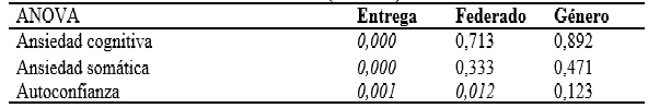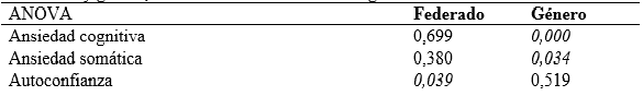 En la tabla 3, se presentan las medias obtenidas por los corredores en las variables psicológicas de las tres subescalas del cuestionario CSAI-2R, en función del momento de entrega del cuestionario, de si se está federado o no, y del género.