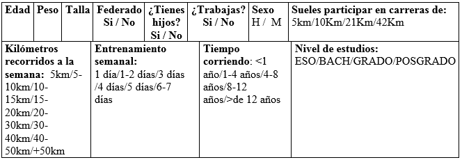 Para la evaluación de las variables personales y sociodemográficas se elaboró un cuestionario de autoinforme ad hoc donde se recogió toda la información pertinente respecto a las variables de práctica deportiva, edad, peso, estatura, género, tipo de carrera en la que suele participar, años continuados corriendo, si está o no federado, nivel de estudios, hijos, trabajo, promedio de kilómetros recorridos a la semana y días entrenados a la semana (Anexo 1)