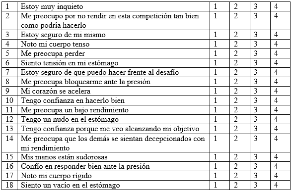 Para evaluar la ansiedad previa a la competición, se utilizó el CSAI-2R de Andrade, Lois y Arce (2007) (Anexo 2), se trata de una versión en español del CSAI-2 de Martens, Vealey y Burton (1990). La forma adaptada resultante consta de 18 ítems distribuidos en 3 subescalas o dimensiones: 1) Ansiedad somática estado, 2) Ansiedad cognitiva estado y 3) Autoconfianza estado. En este, como en los demás cuestionarios, las respuestas a los ítems están reflejadas en una escala tipo Likert con un rango de respuesta de 1 a 4, en la que el 1 corresponde a totalmente en desacuerdo y el 4 a totalmente de acuerdo con la formulación de la pregunta.