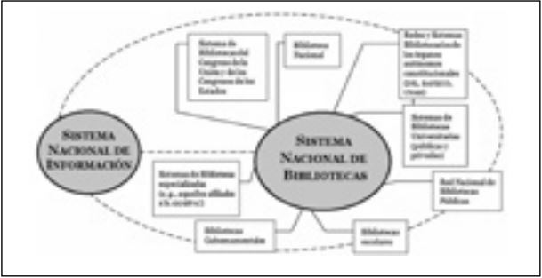 3. El derecho a atraerse información. Puesto que este derecho implica tener acceso a archivos y a documentos públicos (y en ello la decisión sobre qué información se consulta), la tarea del Estado y de las bibliotecas es relevan- te. El Estado tiene que dejar dispuesto un sistema nacional de bibliotecas, que pese a que está fundado en la Ley General de Bibliotecas, no ha sido puesto en marcha desde 1988. Según recomendaciones de la Unesco, el sistema nacional de bibliotecas de cada país debe formar parte, a su vez, de un sistema nacional de información (Figura 1). Una vez que esos sistemas estén funcionando (o al menos las redes bibliotecarias que los constituirían), la biblioteca puede otorgar información pertinente a un usuario (según la definición de Olivé que se dará más adelante), lo que lo ayudará a tomar decisiones y a planear su vida, por lo que la información reforzaría su autonomía y coadyuvaría en la conformación de la identidad personal (Ley General de Bibliotecas, Cap. III “Sistema Nacional de Bibliotecas”, arts. 12-16; Cochrane, 1977, p. 18).