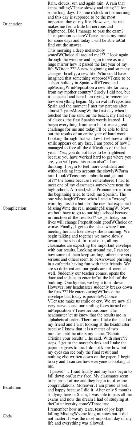 Due to the limitations of this paper, we are just going to offer one example of a narrative written by an English Language V student. This example shows the main structural and grammatical characteristics found in narratives. As we can see, this student has followed the structural aspects of a narrative because we observe a clear orientation followed by complication, and finally, the text ends with a resolution and a coda. Moreover, this text has been chosen because it is representative of some of the main difficulties students registered in English Language V have and of some of the main things they do well following the characteristics of this genre.