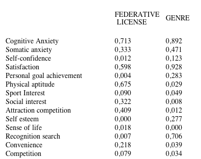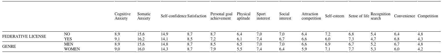 Table 3 presents the averages obtained by competitors in the psychological variables of the three subscales of the CSAI-2R questionnaire, and in each one of the motivational categories of the questionnaire by Barrios (2002), depending on whether it is federated or not and depending on the genre.