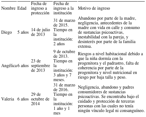 Participaron del estudio, Valeria, Angélica y Diego (2), niños declarados en adoptabilidad por el ICBF. La tabla 1 describe las características de cada uno de los niños.