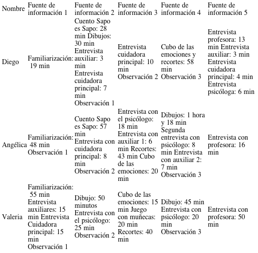 Los instrumentos utilizados fueron: 1) una sesión inicial de familiarización, 2) el cuento infantil Sapo es sapo, de Max Velthuijs, 2) un cuadernillo de dibujos, en el cual se invitaba a los niños a dibujar libremente, a hacer recortes de revistas sobre lo que les interesaba y a conversar sobre su producción, 3) cubo de las emociones, con el que se jugaba a lanzarlo e identificar la emoción proyectada y luego nombrar ejemplos de situaciones en los que habían sentido estas emociones, 4) en el caso de Valeria, se debió utilizar una herramienta adicional y para ello se le proporcionaron tres muñecos de trapo para observar el juego que realizara con estos, e identificar el papel que le asignaba a cada muñeco, 5) entrevistas semiestructuradas con los otros significativos de cada niño. Se realizaron preguntas para indagar sobre los aspectos más relevantes de cada uno como sus gustos, habilidades, dificultades, relaciones con los otros y sobre su proceso en la institución y en el colegio y 6) se realizaron tres observaciones de 30 minutos cada una, por cada uno de los niños, mientras ellos se encontraban realizando actividades cotidianas para identificar sus comportamientos, interacciones y actitudes. En la Tabla 2 se consignan las diferentes fuentes de información y el tiempo empleado en cada una de ellas.