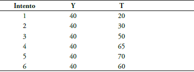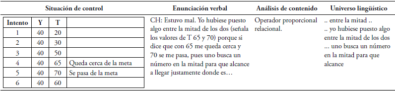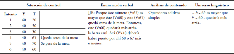 E: “Se muestra lo que hizo otro niño. En el primer intento puso velocidad 40 y tiempo 20; en el segundo intento puso velocidad 40 y tiempo 30; en el tercer intento puso 40 y tiempo 50; en el cuarto intento puso velocidad 40 y tiempo 65 (con estos últimos valores queda cerca de la meta); en el quinto intento pone velocidad 40 y tiempo 70 y ahí se pasa de la banderita, y en el sexto intento pone 40 de velocidad y tiempo 60. ¿Qué piensas de esos dos valores?”. Con esta tarea se busca identificar si el resolutor puede anticipar el valor adecuado de T que ha de ser mayor que el dado a T en el intento n, pero menor que el dado en el intento n + 1.