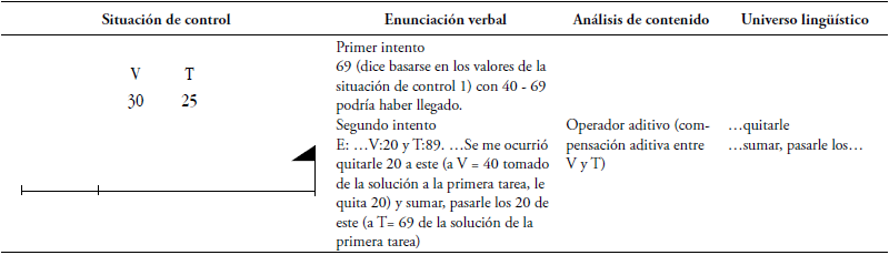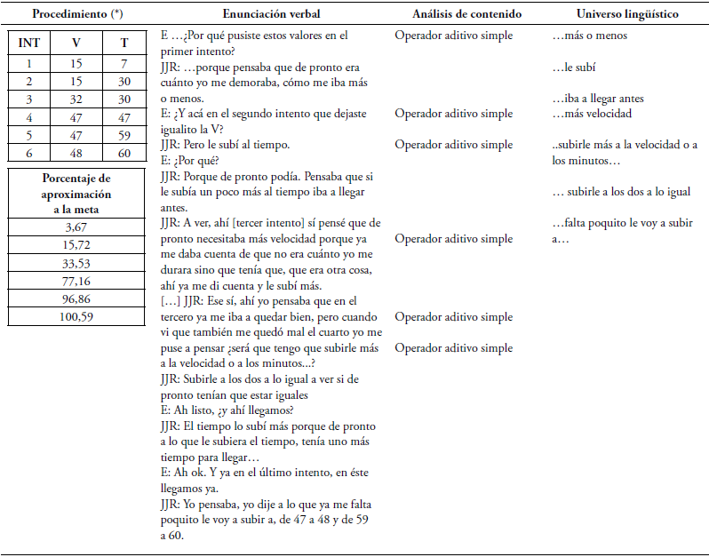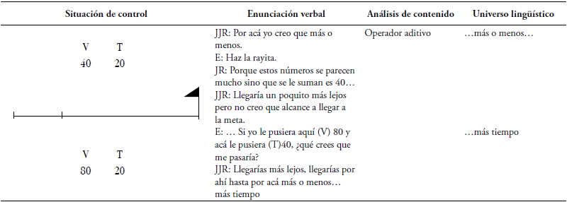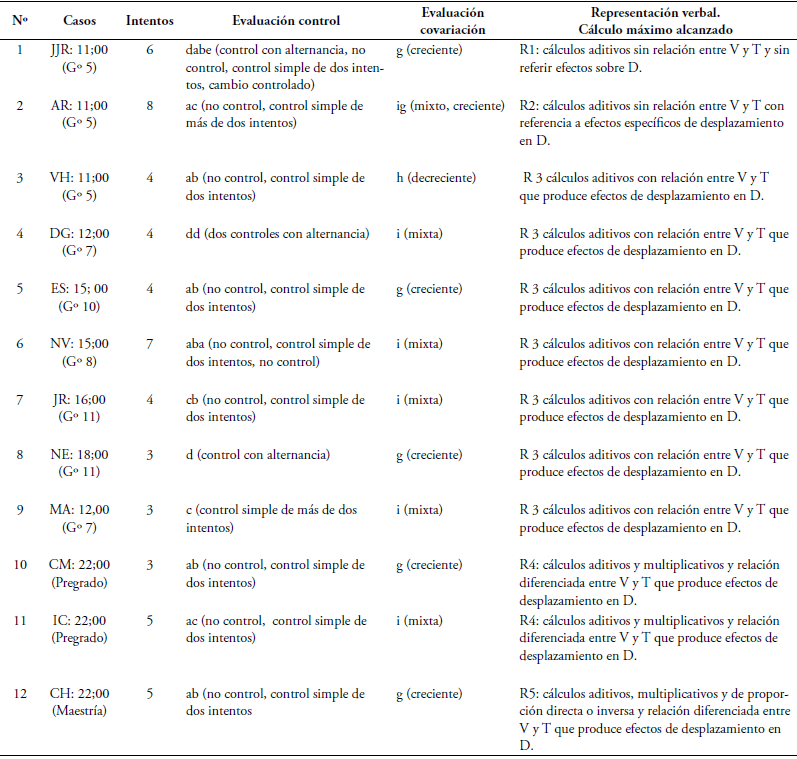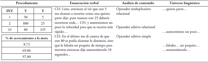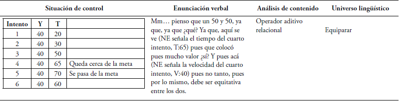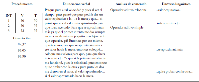 En las oraciones se evidencia el uso de frases relacionales: “entonces si yo duplico la velocidad y duplico el tiempo...” Si bien el procedimiento fue evaluado como no control y control simple¨, las representaciones ver- bales de los operadores evidenciados en el análisis de contenido se muestran a un mayor nivel. Sugiere el uso de una significación representacional donde T y V se relacionan bajo diversos operadores aditivos, multiplicativos y proporcionales, según sea la manera más apropiada de solución.