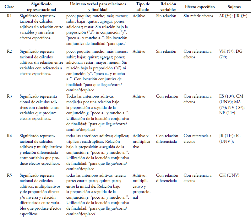 La Tabla 15 revela la distribución de los sujetos respecto de la clase de representaciones utilizadas, en la que se destaca que el mayor número de participantes refiere las de tipo R3, correspondiente a significado representacional de cálculos aditivos con relación entre variables que produce efectos específicos.