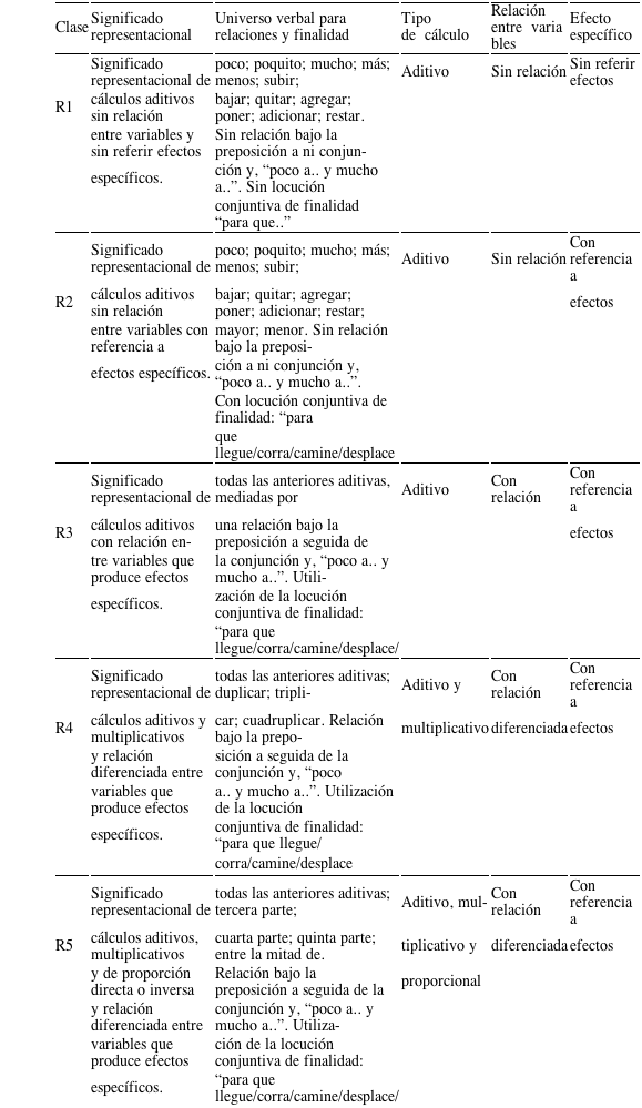 Para el análisis de contenido de los significados representacionales de las operaciones y la relación entre variables se tuvieron en cuenta los tipos de operadores matemáticos posiblemente aplicados a la solución del problema y cinco clases de significados representacionales emergentes a lo largo del análisis del material proporcionado por las entrevistas semiestructuradas. No se descarta que puedan existir otros más.
