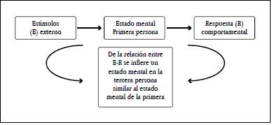 De acuerdo con la Figura 1, el sujeto de la primera persona establece una relación entre un estímulo externo, su estado mental interno x, y una expresión conductual o respuesta fisiológica a dicho estado, de tal manera que en el caso de otras personas, al advertir un estímulo y una respuesta o conducta determinadas se infiere por analogía un estado mental similar al del sujeto de la primera persona.