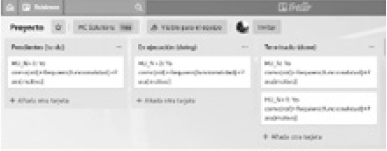 Durante la segunda sesión, según Schwaber & Sutherland (2014), se sugiere que el equipo y todos los interesados deben estar informados constantemente de la evolución de las actividades de desarrollo involucradas dentro del sprint. Aquí se explica cómo crear y manejar un tablero scrum. Una forma fácil de implementar estos tableros es utilizando la herramienta Trello. En esta herramienta se pueden crear tres columnas con la definición base propuesta en los modelos agiles: pendientes (to do), en ejecución (doing), terminado (done). La Figura 2 muestra un ejemplo base de un tablero en Trello bajo la recomendación de Schwaber & Sutherland (2014):