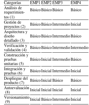 Avanzado. Las empresas conocen muy bien el proceso de desarrollo de software interno gracias a su estandarización. Todos sus artefactos están basados en modelos aceptados y reconocidos internacionalmente y el uso de buenas prácticas es parte de la cultura organizacional.