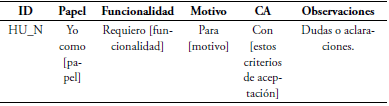 El trabajo empírico es el principal generador de reproceso porque dificulta crear un lenguaje común entre los interesados en el proyecto y distorsiona la visión del producto. Aquí se estandarizó con cada compañía el arte- facto con el que se elicita la información. De acuerdo con Hastie & Wojewoda (2015), los modelos ágiles tienen un mayor impacto en el éxito de los proyectos. Por lo anterior, el uso de historias de usuario se recomendó a todas las empresas. Si bien no existe un estándar para este artefacto, sí hay modelos como el propuesto por Cohn (2004) que hacen simple la labor de crear un lenguaje común entre usuarios y equipo de desarrollo. El modelo propuesto por Cohn sugiere el uso de la siguiente frase: yo como [papel] + requiero [funcionalidad] + para [motivo] + con [estos criterios de aceptación]. Esta frase simplifica la escritura de la historia de usuario permitiendo saber quién ejecuta la acción (papel), qué funcionalidad se espera ejecutar, qué valor le entrega al proyecto (motivo) y cómo compruebo que la historia fue desarrollada completamente (criterios de aceptación). En la primera se explica que las primeras tres partes de la frase yo como [papae] + requiero [funcionalidad] + para [motivo] responden a la denominación de historia de usuario épica según Cohn (2004). Aquí se aprendió a dominar este concepto y a elaborarlas correctamente, manteniendo la claridad sobre el motivo y la atomicidad de las historias (que respondan a una sola funcionalidad). La segunda sesión buscó apropiar el concepto y la forma de escribir los criterios de aceptación. Las recomendaciones dadas para la escritura de estos consisten en ubicar dónde sucede la acción (pantalla), especificar los campos que se requieren utilizar en esa funcionalidad, si es posible de una vez indicar el tipo de dato, tamaño, restricciones no funcionales, mensajes de error o de éxito y llamados a otras historias en caso de ser necesario para mantener la atomicidad. Una vez puestos en marcha los conceptos aprendidos, las empresas desde una etapa inicial (primera entrevista con el usuario) pueden generar una descripción utilizando el mapa de historias (técnica que permite una división funcional por posibles módulos de un aplicativo) haciendo uso de la definición épica. Posterior a la detección del mínimo producto viable, que en otras palabras es lo que se alcanza a hacer en el tiempo y presupuesto esperado, el equipo puede entrar a construir el detalle de las historias de usuario complementándolas con los criterios de aceptación. Adicional a lo explicado en las dos sesiones, se diseñó un formato que facilita la aplicación de lo visto. En la Tabla 2 se aprecia un ejemplo del formato creado.