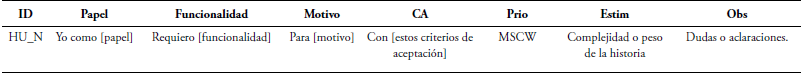 Para hacer una correcta gestión de proyectos es necesario partir de un buen análisis de requisitos, consolidado en este modelo a través de un product backlog. Hay varias buenas prácticas que se pueden tomar de lo propuesto en Schwaber & Sutherland (2014). Primero, para delimitar el alcance real del proyecto se debe definir claramente la prioridad de atención de las historias de usuario y luego estimar la complejidad asociada a estas para fijar una planeación de fechas de entrega. Por lo anterior, el formato de product backlog propuesto en la sección anterior sufre una modificación que permite adicionarle dos columnas que incluyen los valores correspondientes a la priorización y a la estimación de cada historia de usuario, que serán los objetivos de las dos sesiones realizadas con cada empresa (Tabla 3).
