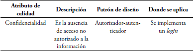 El DAS se divide en dos partes. La primera consiste en la identificación de los atributos de calidad y patrones de diseño que permiten guiar la arquitectura. La segunda es su representación a través de diagramas UML. La primera sesión con las empresas buscó apropiar el concepto de atributos de calidad que responden al comportamiento deseado frente a requerimientos del sistema, como son la portabilidad u la mantenibilidad, entre otros. Con la identificación correcta de los atributos en un proyecto de ejemplo, la sesión dos ayudó a las empresas a entender cómo hacer un mapeo base que permita identificar los patrones de diseño asociados a los atributos de calidad. Un patrón de diseño se puede considerar como una solución que ya existe y está comprobada para resolver un problema ecurrente. Algunos patrones son el singleton y la inyección de dependencias. Una vez apropiados los conceptos anteriores, en la tercera sesión se explica cómo diagramar las vistas sugeridas por Kruchten (2006) utilizando UML. La Tabla 4 muestra un ejemplo de mapeo básico elaborado en las empresas para proyectos en Java y php que sirve de base y les permite a las empresas que esta plantilla siga creciendo, evolucionando o variando de acuerdo con los retos a afrontar en cada proyecto.