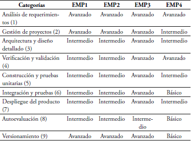 Al finalizar el proceso de capacitación y acompañamiento a las empresas, se aplicó el mismo instrumento de evaluación de las buenas prácticas en las compañías para categorizar y clasificar el nuevo perfil, de acuerdo con lo que sugiere la norma ISO 29110. El resultado de la evaluación final se puede observar en Tabla 5. Al comparar con los resultados de la encuesta inicial presentada en la Tabla 1, se aprecia que todas las empresas mejoraron en todas las categorías y que dicho cambio implicó en algunos casos, cambios de valoración significativos. Por ejemplo, de básico a avanzado, así como otros fueron un poco más progresivos como de básico a intermedio.