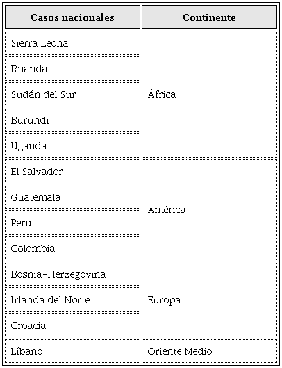 Por medio del proceso de selección se lograron identificar diversos estudios específicos o comparados que abordan las experiencias formativas de trece países: cinco africanos, cuatro latinoamericanos, uno de Oriente Medio, y tres europeos (Tabla 1). Tras la lectura, los hallazgos de estos estudios fueron interpretados por medio de cuatro dimensiones analíticas emergentes: 1. procesos de olvidar o recordar; 2. papel de los agentes y dispositivos educativos; 3. objetivos de la enseñanza de la historia, y; 4. retos en la investigación alrededor de la enseñanza de historias difíciles.