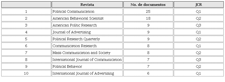 En la Tabla 1 se presentan las diez revistas con mayor número de artículos científicos publicados en el campo de la publicidad política. Llama la atención que cuatro de estas revistas se posicionan como JCR-Q1, cuatro como JCR-Q2 y las últimas dos como JCR-Q3. Seis de ellas pertenecen al área del conocimiento de la comunicación, tres se enmarcan en el contexto de la ciencia política y una pertenece a las ciencias sociales interdisciplinarias.