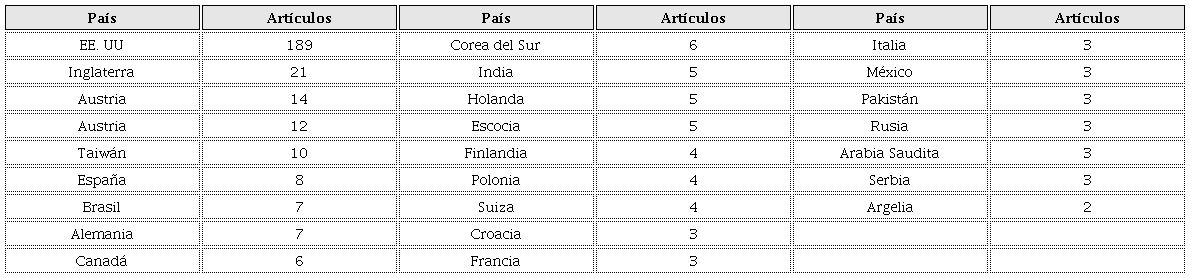 Como se puede apreciar en la Tabla 2, la mayor cantidad de artículos científicos publicados en el campo de la publicidad política se concentra en países angloparlantes como Estados Unidos, Inglaterra y Canadá. Destaca que de los 295 documentos analizados, solamente diez se han publicado en Latinoamérica, específicamente Brasil encabeza la lista con siete documentos seguido por México con tres.