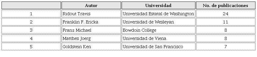 En la Tabla 3 se presentan los cinco autores con mayor producción científica en el campo de la publicidad política. Un aspecto importante consiste en que cuatro de estos autores se encuentran afiliados a universidades estadounidenses. Ridout, profesor distinguido de la Universidad Estatal de Washington encabeza la lista con veinticuatro artículos publicados. Destaca por haber estudiado ampliamente los efectos de la publicidad política televisada (Franz & Ridout, 2007). En segundo lugar, se encuentra Franklin Fowler con once documentos. Esta autora, al igual que Ridout, se ha preocupado por estudiar el papel de la publicidad televisada y en medios tradicionales (Fowler & Ridout, 2009; Fowler et al., 2015). Franz, ocupa el tercer lugar con ocho documentos publicados. Se destaca por estudiar la relación entre publicidad política y democracia (Freedman, Franz, & Goldstein, 2004). En cuarto lugar se ubica Matthes, también con ocho artículos, quien se ha preocupado por explorar la discriminación, el tratamiento a las minorías y los inmigrantes en publicidad política (Matthes & Schmuck, 2015; Schmuck & Matthes, 2017). Finalmente, Goldstein, con siete artículos, estudia los efectos de la publicidad política sobre el electorado (Goldstein & Freedman, 2002).