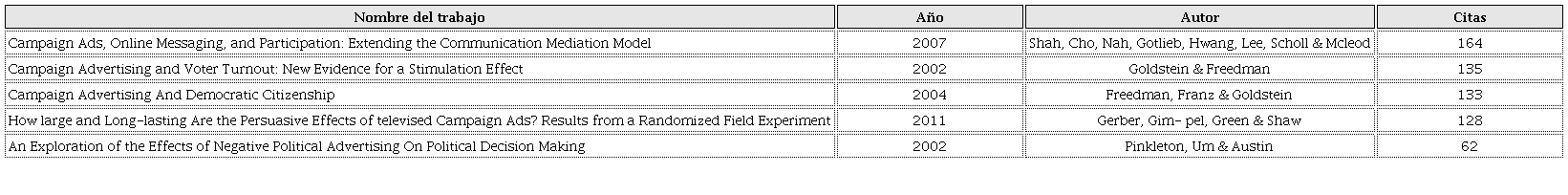 En la Tabla 4 se presentan los artículos con mayor impacto en términos de citaciones obtenidas en el campo de publicidad política. El trabajo de Shah et al. (2007), se ubica en primer lugar con 164 citaciones y aborda el papel de la publicidad política en la vida cívica y política de los individuos. Sus resultados sugieren que la publicidad política aumenta la intención de buscar información sobre los procesos electorales por parte de los votantes. No obstante, los anuncios agresivos o de “ataque” disminuyen las motivaciones de buscar información en los medios impresos y de difusión, al tiempo que reducen la participación en la vida cívica y política. El estudio de Goldstein & Freedman (2002) alcanza el segundo lugar de los artículos más citados con 135 citaciones y al igual que el texto anterior, se enmarca en el contexto de la publicidad política negativa. Estos autores proponen que la publicidad política negativa en lugar de reducir el tamaño del electorado estimula la participación de los ciudadanos al atraer nuevos votantes potenciales. En tercer lugar se ubica el trabajo de Freedman, Franz & Goldstein (2004) con 133 citaciones. Este estudio sugiere que la exposición a los anuncios políticos aumenta el interés de los ciudadanos y mejora las probabilidades de que estos salgan a votar. El trabajo de Gerber, Gimpel, Green & Shaw (2011) alcanza el cuarto escaño con 128 citaciones y demuestra que aunque la publicidad política tiene efectos significativos sobre las preferencias de votación de los electores, dichos efectos son de corta duración. Por último, el estudio de Pinkleton, Um & Austin (2002) ocupa el quinto lugar con 62 citaciones y propone que en términos generales, la publicidad negativa es mucho más efectiva que su contraparte positiva.