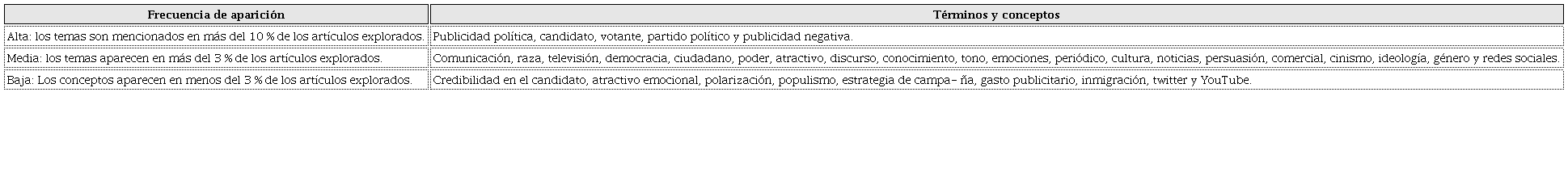 Por otra parte, el análisis de frecuencia de aparición de los términos permitió elaborar categorías respecto a los conceptos que aparecen ampliamente en la literatura, en contraste con aquellos que apenas empiezan a generar interés en los investigadores. Específicamente, los interesados en la publicidad política deberían preocuparse por estudiar el papel que juega la credibilidad en el candidato sobre los efectos de los anuncios. La importancia del atractivo emocional de las piezas de comunicación política es también una cuestión que podría ofrecer oportunidades de investigación. El papel que desempeña la publicidad política sobre los fenómenos de la polarización y la inmigración, se constituye en un área de estudio interesante.