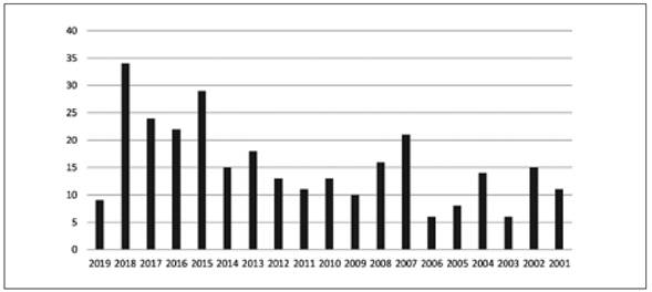 En la Figura 2 se presenta la tendencia de producción científica en el campo de la publicidad política a lo largo del tiempo. Se evidencia que en los últimos cinco años la publicación de artículos académicos en este campo ha crecido considerablemente. Además, el año 2018 ostentó el mayor número de publicaciones con 34 artículos. Vale la pena aclarar que a la fecha de esta investigación, para el año 2019 todavía no se presentan datos concluyentes.