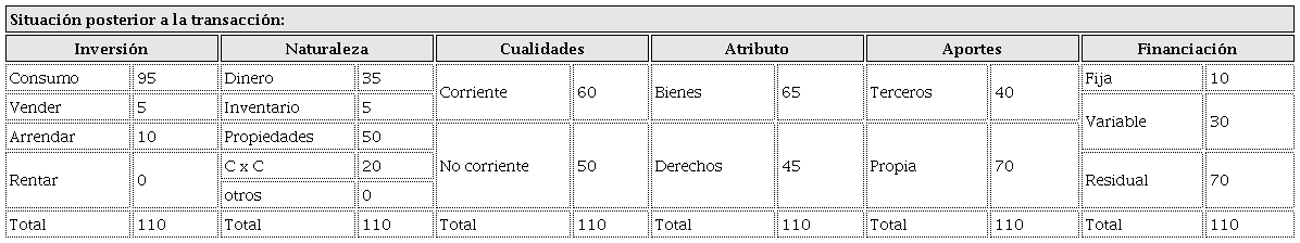 Otro ejemplo nos remite a una entidad financiera que presta dinero a un empresario. Esta transacción mueve todas las estructuras porque aumenta los recursos. En inversión aumenta el conjunto de “uso”; en naturaleza, “dinero”; en cualidades, “corriente”; en atributo, “monetario”; en aportes, “terceros”, y en financiación, “variable”, entre otros.