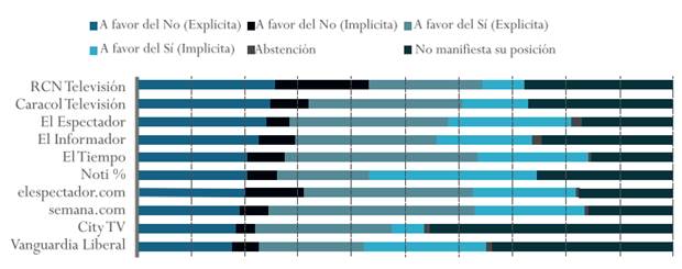 Precisamente, la investigación a cargo de la Misión de Observación Electoral, denominada Medios de comunicación y plebiscito de refrendación de los acuerdos de paz, a partir de una medición cualitativa y cuantitativa de la información producida por diversos medios (prensa-digital e impresa, radio y televisión), observa la posición tan marcada de los principales canales informativos del país al citar reiteradamente fuentes a favor del no, tal como se presenta en la Gráfica 2.