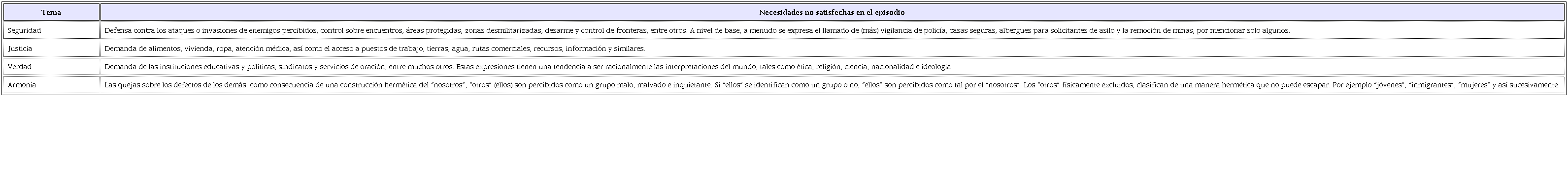 Se sigue con el relacionamiento de los temas, que, como se mencionó, se desprenden de las familias de paces: armonía, justicia, seguridad y verdad. El asunto neural aquí es identificar el tema percibido como primario, cuya clave tiene que ver con la ubicación de las necesidades no satisfechas en el episodio conflictivo, que define el punto de entrada al conflicto (Cuadro 3).