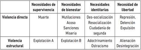 Galtung desarrolla sus planteamientos a partir de correlacionar su triángulo de las violencias con las cuatro necesidades básicas: supervivencia, bienestar, reconocimiento y libertad, que hace corresponder con una de sus tesis más potentes: entender que “la violencia puede ser vista como una privación de los derechos humanos fundamentales” (Galtung, 2016, p. 150). (Cuadro 1). Luego, agrega a las necesidades básicas humanas el derecho a un medioambiente que garantice el equilibrio ecológico fundamental, para la conservación de la vida en el planeta.
