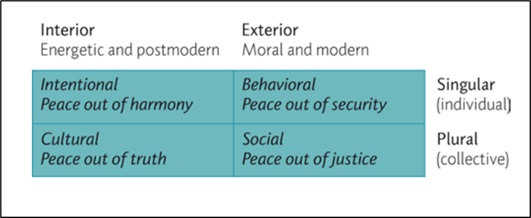 En un exhaustivo estudio histórico llevado a cabo por Dietrich sobre las diversas concepciones de paz que emergen de diversidad de contextos culturales, denominado Many Peaces (muchas paces) y del cual hace mención el autor en un breve artículo publicado en 2014, recoge las diferentes formas de paz en lo que denomina los cuatro grandes grupos de familias de paces, a saber: la energética, la moral, la moderna y la posmoderna, de las que desprende su centro de gravitación esencial (Dietrich, 2014), (Cuadro 2).