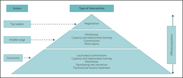 Por último, en el mapeo elicitivo del conflicto se tienen en cuenta los niveles de la pirámide de Lederach explicados anteriormente y que refieren los actores, que en sus interacciones son los llamados a resolver el conflicto -nunca de manera definitiva-, las comunidades en la base, los expertos y los líderes regionales en la capa media, y el jefe de Estado en la cima de la pirámide, a quien corresponde la negociación.