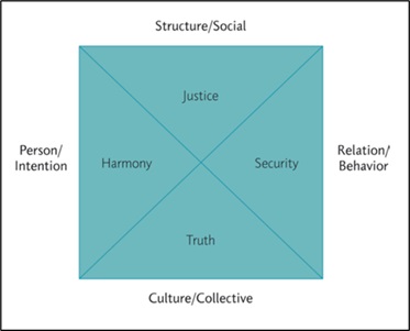 Desde esta concepción, la búsqueda de la paz es la búsqueda inmanente de la armonía, de la cual Dietrich (2014), expresa: “La armonía se forma en Tao, cuando los seres humanos, en resonancia con la respiración divina, interfieren lo menos posible con el flujo de lo natural. Por consiguiente, el dejar pasar (wu-wei) es una virtud del entendimiento taoísta de paz” (Dietrich, s. d., pp. 1-17). Concepción a partir de la cual integra, en un equilibrio dinámico, los ejes temáticos de las demás familias de paces, redimensionando así la pirámide del conflicto, de Jhon Paul Lederach, cuya vista frontal revela las interacciones conflictivas de una sociedad disfuncional, desde la base de la pirámide -donde se encuentra la población en general- y las acciones locales por desarrollar a fin de avanzar en la resolución del conflicto, pasando por la capa media donde se encuentran los expertos regionales, hasta llegar a la capa superior conformada por los líderes o jefes de Estado. En ella se concentra la negociación (Figura 1). A está pirámide, Dietrich agrega los cuatro temas centrales de las familias de paces, en una vista de la pirámide desde arriba (Figura 2).