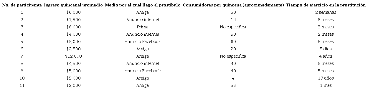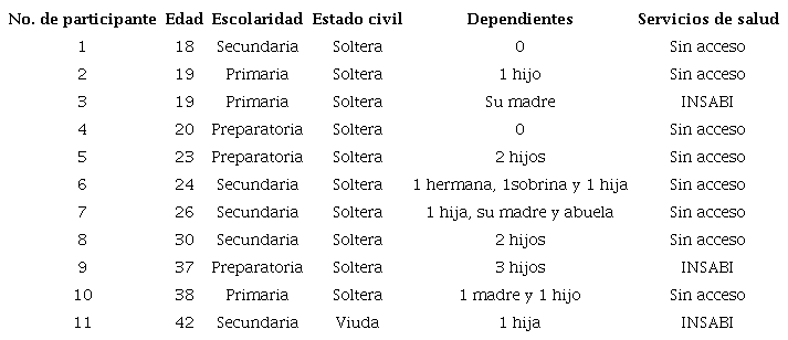En la Tabla 1 se recuperan algunos de los datos sociodemográficos de mayor relevancia de las mujeres participantes. El promedio de edad fue de 26.9 años, con una mínima de 18 y una máxima de 42. En lo que respecta a la escolaridad, cinco estudiaron la secundaria, tres terminaron la preparatoria y otras tres estudiaron hasta la primaria. La mujer de mayor edad era viuda y el resto solteras, sin embargo, el 75 % tenía por lo menos un hijo. En cuanto a la presencia de dependientes económicos, sólo dos dijeron no tenerlos, el resto señaló que tenía hijos que dependían de su ingreso, otras mujeres pagan la manutención de sus madres, hermanas o abuelas. Finalmente, en lo que respecta al acceso a los servicios de salud, la mayoría (72.7 %) dijo no tener acceso, el resto señaló contar con el Instituto Nacional de Salud para el Bienestar (INSABI, s.f.), el cual es un programa que presta de manera gratuita servicios de salud, medicamentos e insumos a las personas sin seguridad social.