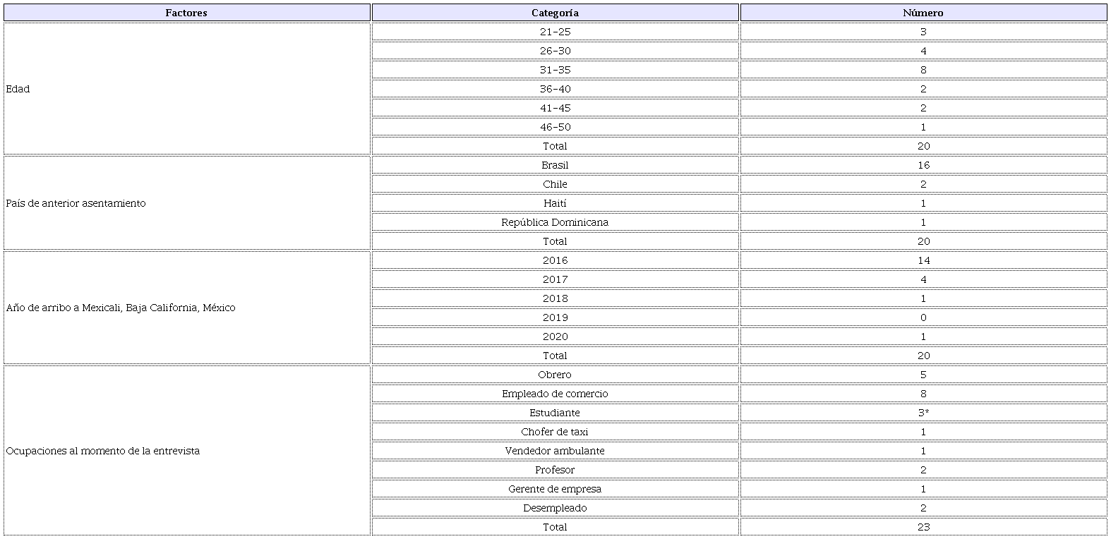 Los criterios de selección de los entrevistados son acordes con los objetivos de la investigación, primordialmente toman en cuenta aspectos socio-demográficos y de origen migratorio. Todos los participantes fueron localizados a través de la técnica denominada bola de nieve. Las entrevistas fueron realizadas entre octubre de 2020 y agosto del 2021, en Mexicali, B.C., como parte de un proyecto más amplio sobre identidades y frontera. La mayor parte de los entrevistados son jóvenes adultos, entre 26 y 35 años. Entre los países de asentamiento previo a su llegada a la frontera México-EE. UU. sobresale Brasil. Por otra parte, 14 de los 20 entrevistados arribaron en el año 2016 y el resto en 2017; es decir, acumulan un lustro de “vida en espera” en Mexicali. Respecto a sus ocupaciones, son los empleados de comercio y obreros de maquiladora quienes registran mayores índices. Se destaca que tres de los entrevistados son estudiantes universitarios, actividad que combinan con algún empleo (ver Tabla 1).
