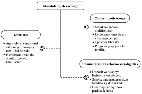 La movilidad forzada tiene vínculos estrechos en la dimensión conceptual y en la dimensión práctica con el desarraigo. Este se vive en situaciones en las que actores sociales se ven obligados a emigrar de su territorio cultural a otro (Louidor, 2016). Estos procesos implican cambios en distintas dimensiones (del “ser”, del “estar” y del habitar) durante el tránsito, la espera y la llegada al nuevo lugar, que desencadenan estados emocionales particulares (Ariza, 2017).