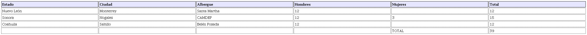 El trabajo se realizó en el otoño del año 2018 y se visitaron tres albergues de la frontera norte de México. Uno ubicado en la ciudad de Monterrey, en el estado de Nuevo León; otro en la ciudad de Nogales, en el estado de Sonora, y en la ciudad de Saltillo, perteneciente al estado de Coahuila. En cada ciudad se visitó un albergue dedicado a la atención de migrantes que se encuentran en una situación migratoria irregular. En el momento de la visita se invitó a todos los presentes a ser parte de este ejercicio, explicándoles de qué se trataba. Sólo algunos aceptaron. La participación total fue de 39 migrantes (Tabla 1), 12 en el albergue Casa del Forastero Santa Martha, ubicado en la ciudad de Monterrey; 15 en el albergue Centro de Atención a Migrantes Deportados (CAMDEP), Iniciativa Kino para la Frontera, ubicado en la ciudad de Nogales; y 12 en el albergue Frontera con Justicia A.C. (Casa del Migrante de Saltillo, Ex Belén Posada del Migrante), ubicado en la ciudad de Saltillo.