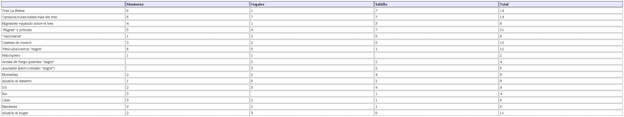 Los 39 dibujos colectados dan cuenta de una realidad estudiada y clasificada que deja una evidencia sobre los principales problemas a los que se enfrentan los migrantes que cruzan por México hacia Estados Unidos de forma indocumentada. En estricto rigor, visibilizan las violencias de la travesía. Como la mayoría de los dibujantes provenía de Centroamérica, los dibujos representan, en general, la travesía desde el sur al norte, principalmente en La Bestia. En este caso y para este trabajo, la identificación de elementos representativos (connotativos) tuvo una primera clasificación por la interpretación de las situaciones más dibujadas en general. Las cuales fueron: la persecución, represión y extorsión por parte de las autoridades (policías, oficiales de migración, controladores de vías y crimen organizado); las dificultades asociadas al trayecto: falta de alimentos, condiciones climáticas adversas (lluvia y frío en el sur y altas temperaturas en el norte) y características geográficas del terreno (desierto, montañas, ríos).