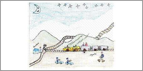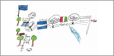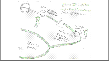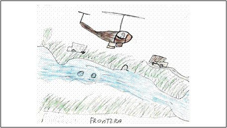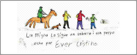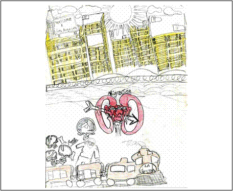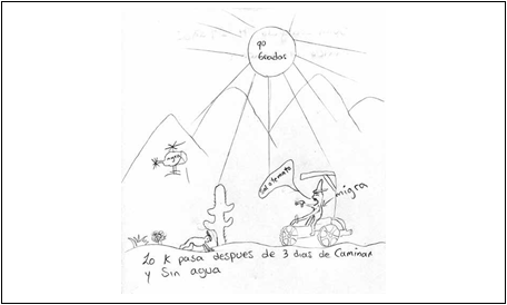 Uno de los dibujantes graficó todo el proceso migratorio por etapas, desde que sale de su lugar de origen hasta que llega a la frontera. Es un dibujo muy completo donde aparecen todas las categorías y elementos mencionados, y que da cuenta de una travesía llena de violencia y violación a sus derechos. A continuación, presentamos algunos dibujos (imágenes 4, 5, 6, 7, 8 y 9) que refieren lo señalado en la Tabla 2.