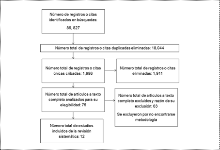 La búsqueda a profundidad dio como resultado 86,827 documentos tanto en idioma inglés, como español, de los cuales 18,044 estaban duplicados. Lo anterior permitió un proceso de cribado con los criterios de inclusión para conservar 1,986 de estos, 75 se analizaron a texto completo para su elegibilidad y se eliminaron 59 por no encontrarse la metodología usada. Para el presente trabajo de investigación se conservaron un total de 12 documentos, entre artículos, libros e informes institucionales. Véase Figura 1. diagrama de flujo.
