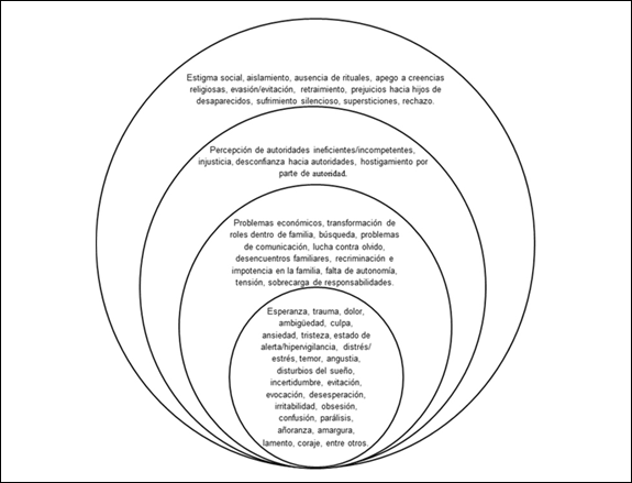 Para atender los procesos de salud mental, las repercusiones que experimentan las víctimas secundarias de desaparición se han diagnosticado como trastornos psiquiátricos, tales como duelo (Córdova, 2015; Lenferink et al., 2017; Morbiato, 2017; Piasek, Noailles & Gutiérrez, 2016; Rodríguez, 2016), depresión (Comité Internacional de la Cruz Roja, 2014; Human Rights Watch, 2013, Lenferink et al., 2018; Lenferink et al., 2017; Obando et al., 2012) y estrés postraumático (Human Rights Watch, 2013; Lenferink et al., 2018). Sin embargo, las categorías preestablecidas ante situaciones emergentes, poco documentadas o atendidas, no parten de comprender la experiencia de las víctimas y el contexto sociopolítico en el que surgen (Almanza, Gómez & Hernández-Brussolo, 2019).