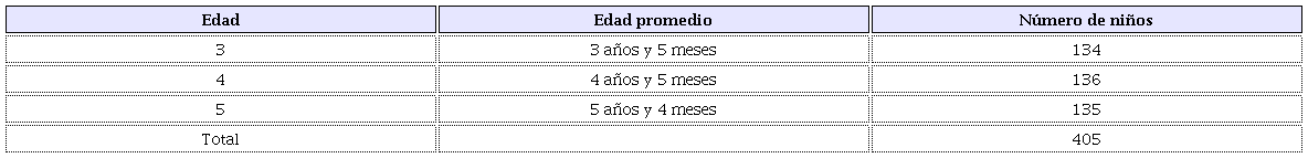 Un grupo de 405 niños entre tres y cinco años que viven en las ciudades de Cali (204 niños) y Santa Marta (201). La muestra fue elegida deliberadamente y se distribuyó de la siguiente manera: 134 niños de tres años, 136 de cuatro y 135 de cinco. Los niños asisten a Hogares Comunitarios del Instituto Colombiano de Bienestar Familiar, en sectores urbanos pobres de ambas ciudades colombianas. La Tabla 1 presenta la distribución de la muestra:2